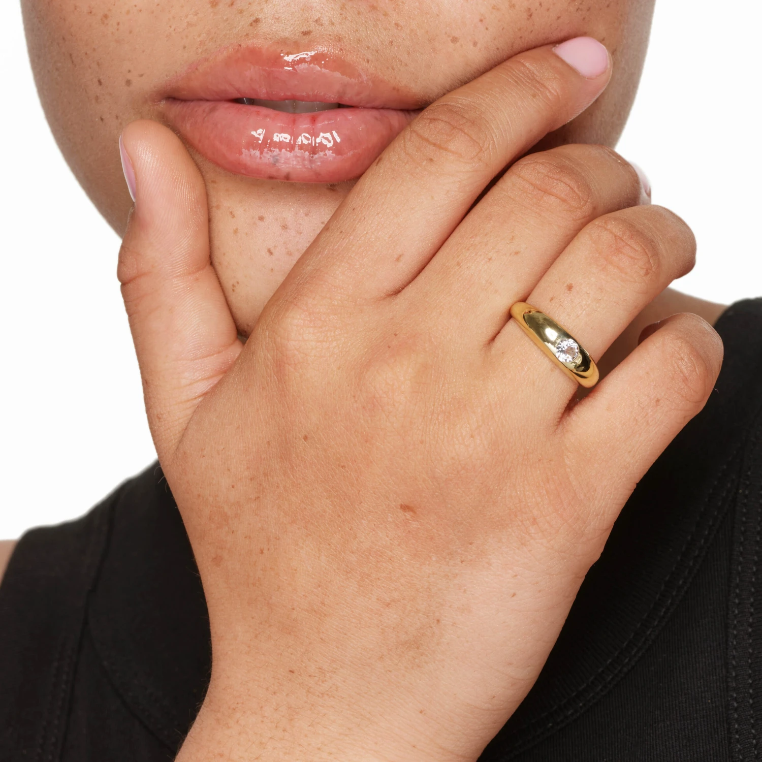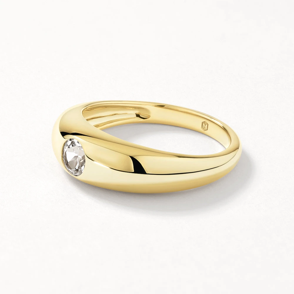 Take your jewellery look to chic new heights with a pinky ring. This inset ring is crafted in 18k fine gold plating with a round cut white topaz as its centrepiece, for a statement yet classic aesthetic. Style this gold plated gypsy ring alone for effortless minimalism, or pair back with stacked gold and topaz jewellery.