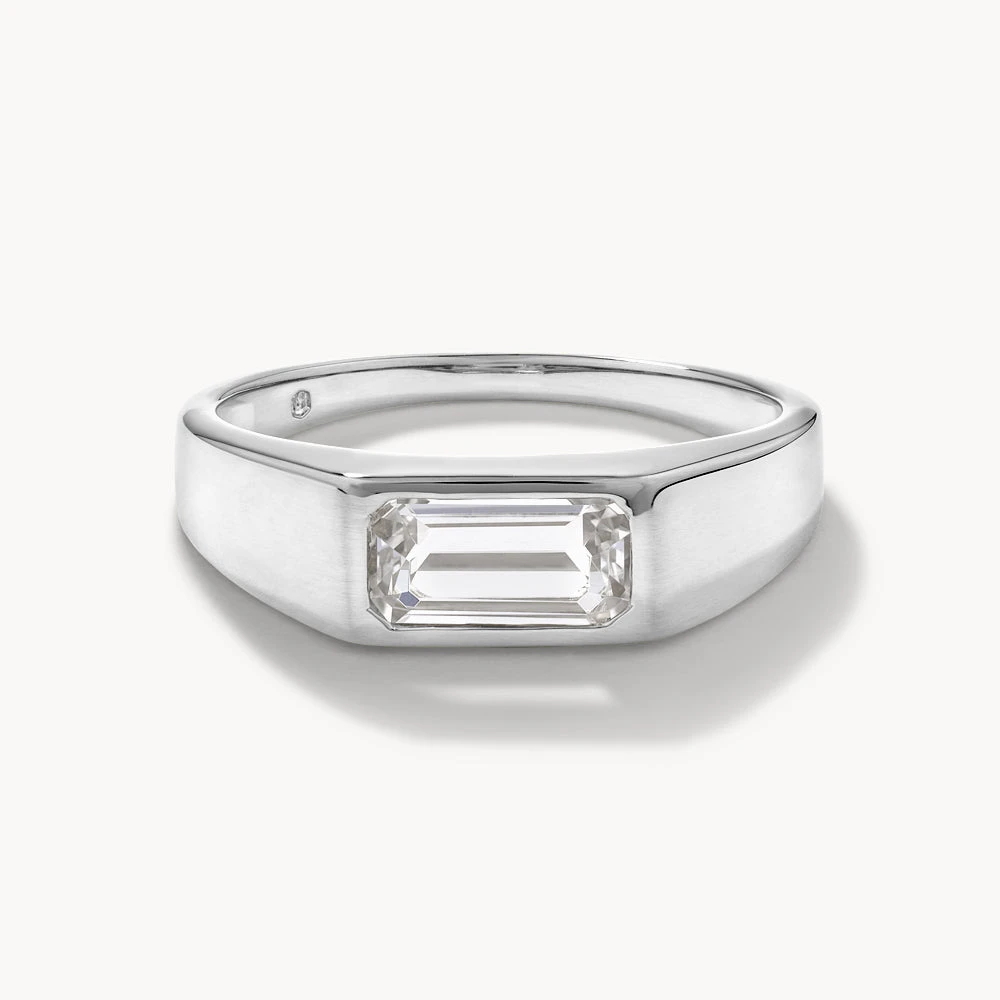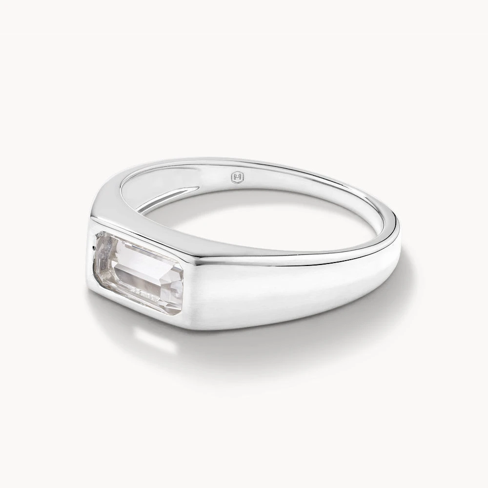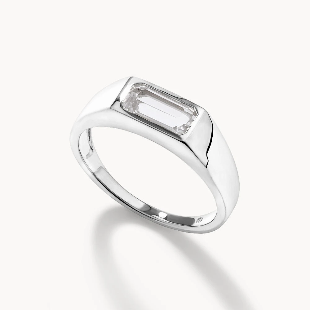 Bring a bold touch to your ring stack with this white topaz pinky ring. Combining gypsy ring vibes with a timeless silhouette, this signet ring is crafted in 925 sterling silver with a solitaire, emerald cut white topaz as its centrepiece. Available in 5 sizes.