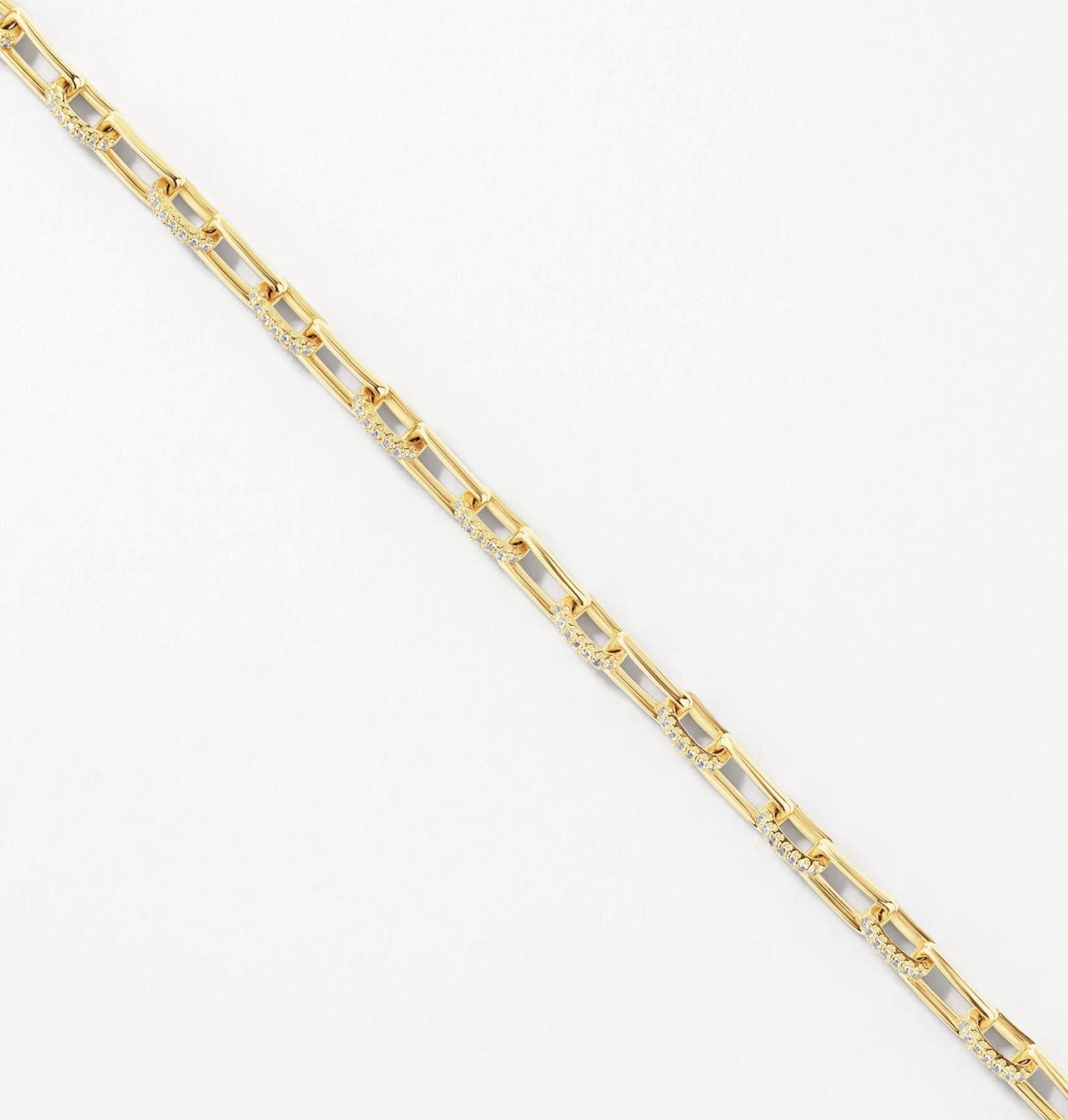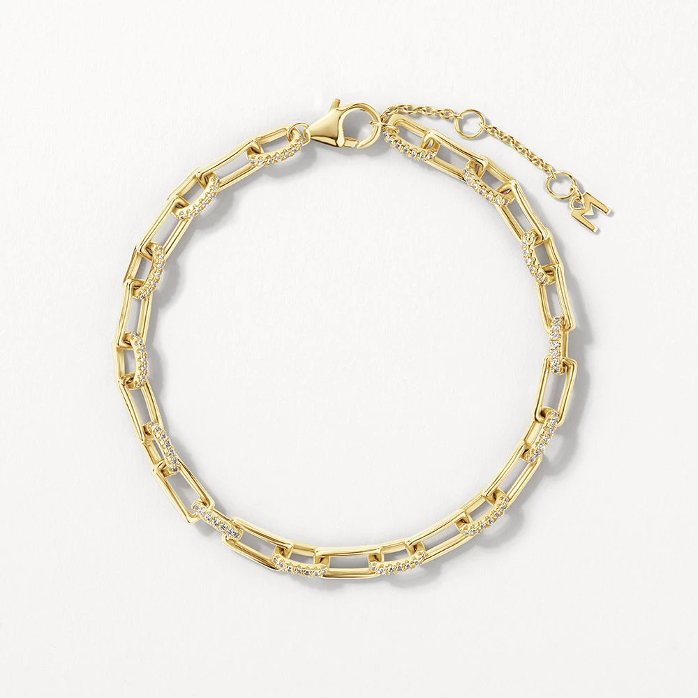 The classic paperclip chain bracelet of your dreams, with added statement shimmer. Crafted in 18k fine gold plating, this bracelet features alternating gold and pav� paperclip links, encrusted with white zircon gemstones. Wear alone for bold minimalism, stack with gold bracelets, or style alongside other white topaz styles.