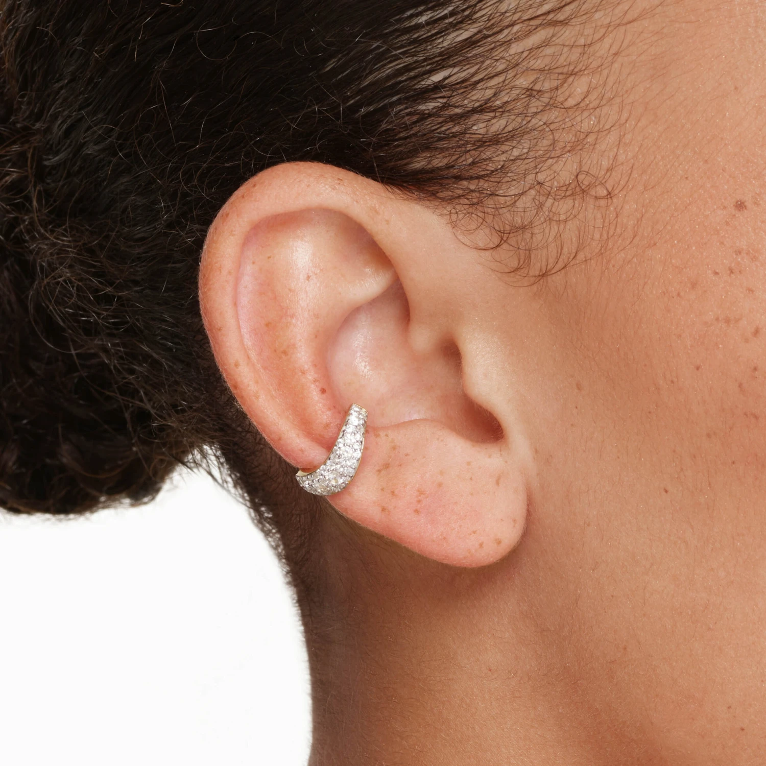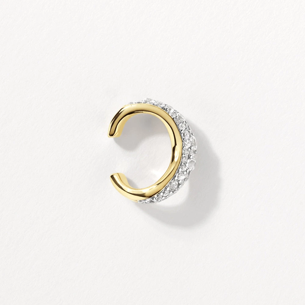 Bring a fresh wave to your earring wardrobe with this easy to wear, no piercing cuff. Designed to hug your ear cartilage, its organic cuff design and white zircon pave add a statement touch to your personalised ear party stack. Layer with our wave ear cuff in gold for a bold co-ord look.