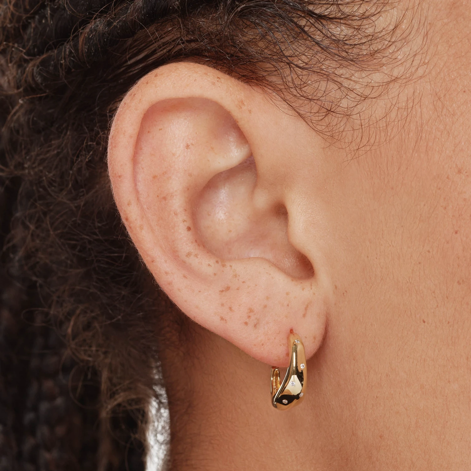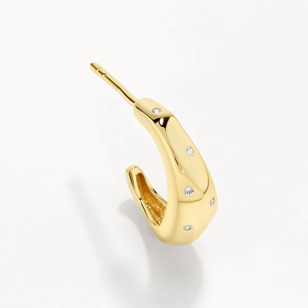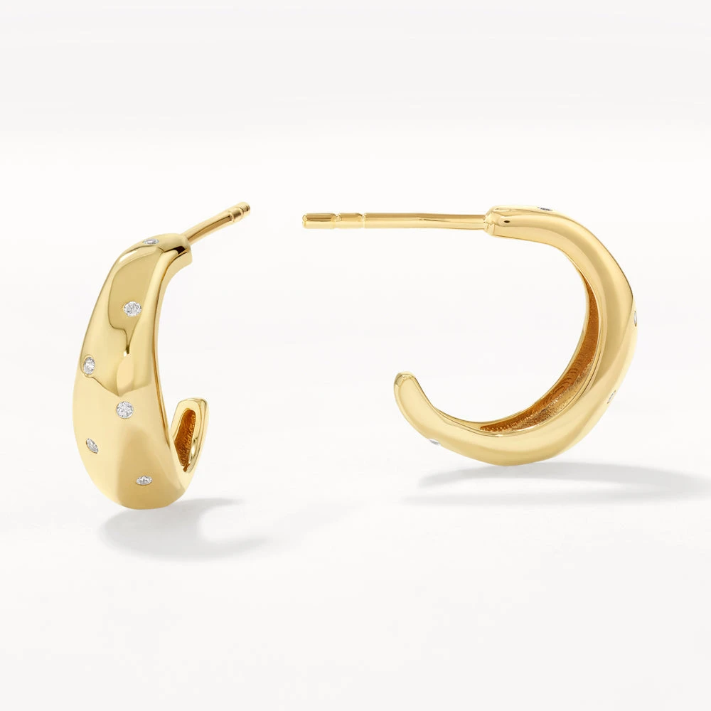 Unique, playful, and chic all at once, add these white zircon spot earrings to your collection. Featuring an organic dome silhouette studded with white zircon polka dots, these are gold hoop earrings with a whimsical edge. Crafted in 18k gold plating, pair them back with the matching bangle and ring for the full look.